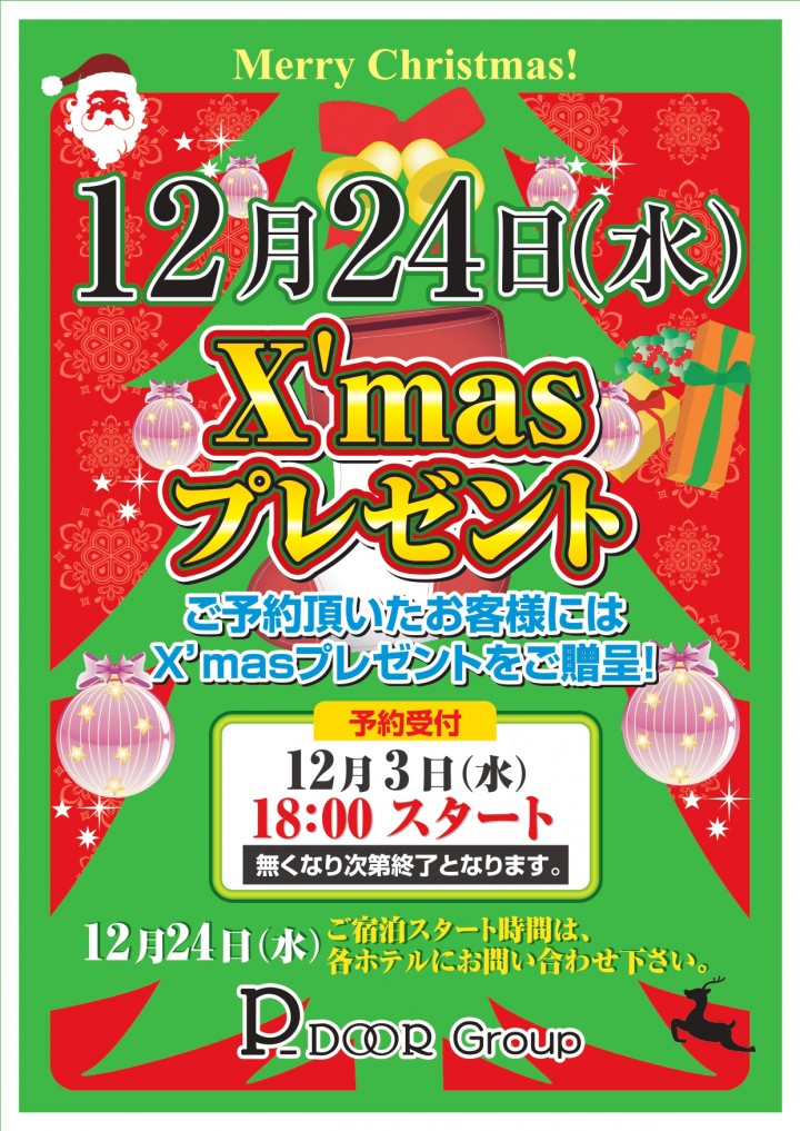 12/3(水)18:00より、12/24(水)X'masの宿泊予約の受付開始です!